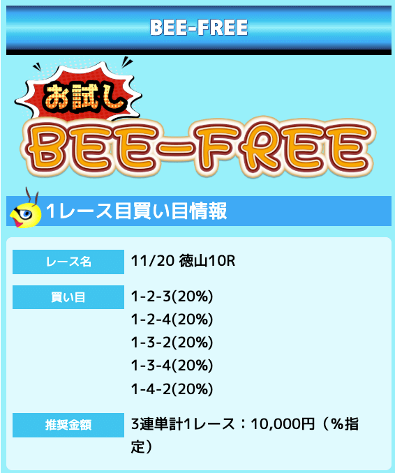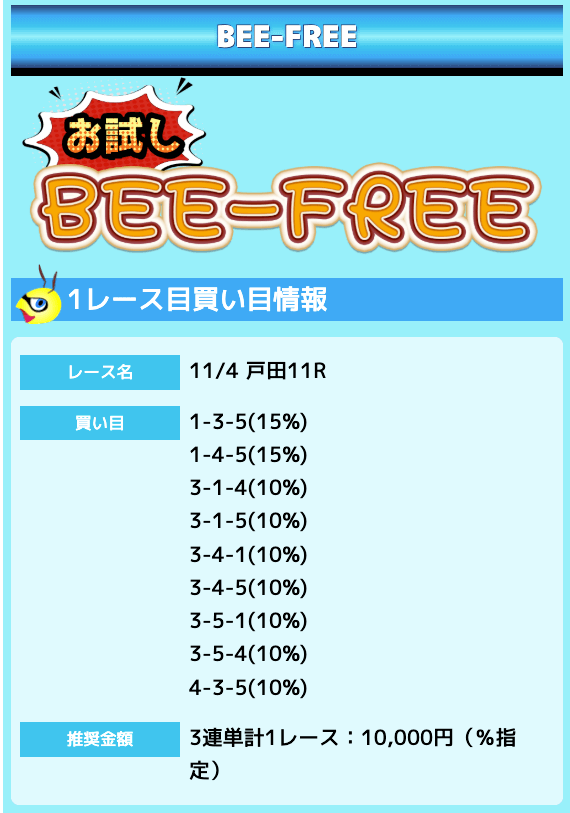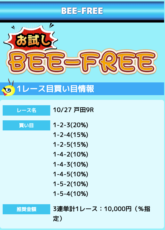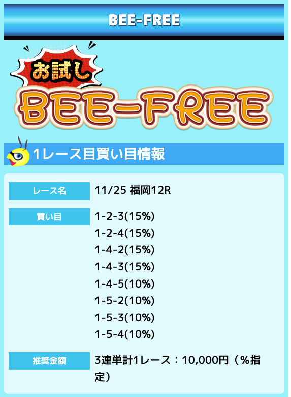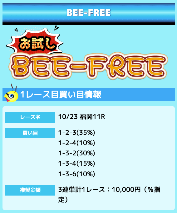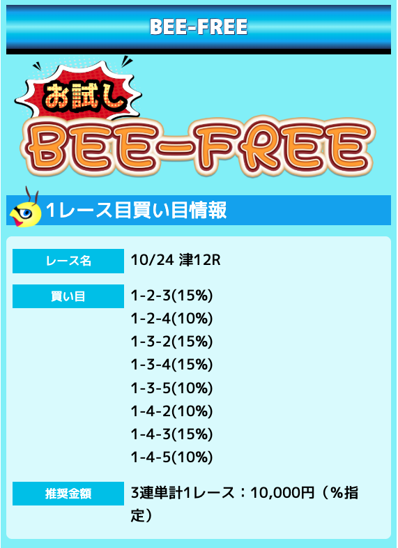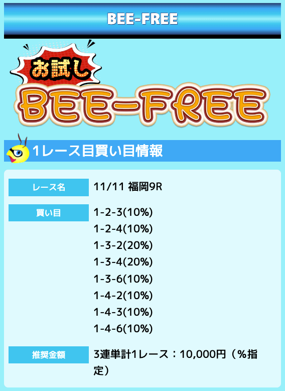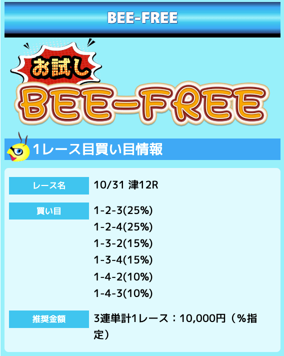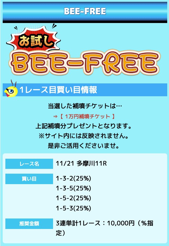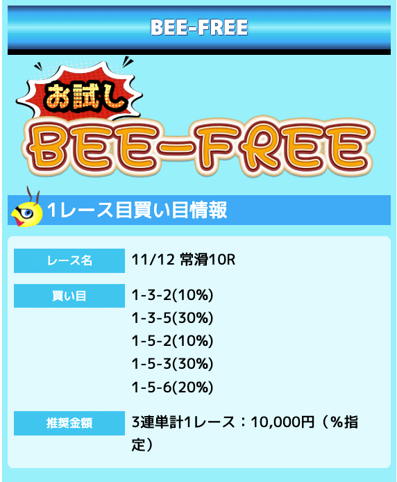 | BEE-TRIAL | 6,000円 | 60,000円 | 10.00倍 | 2レース |