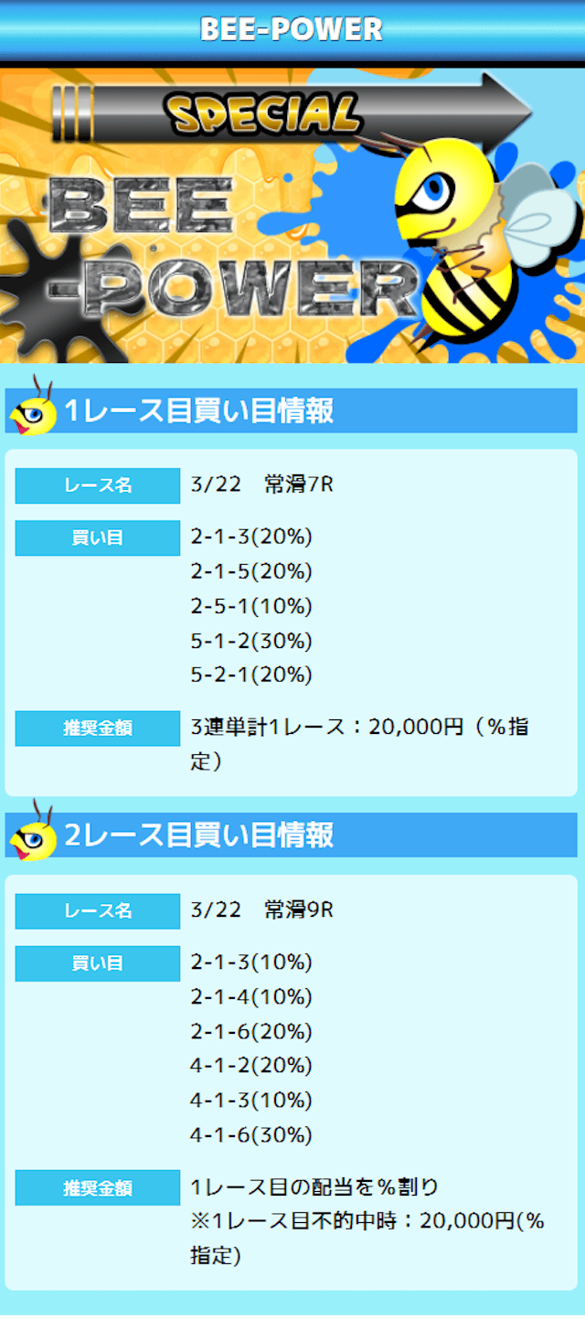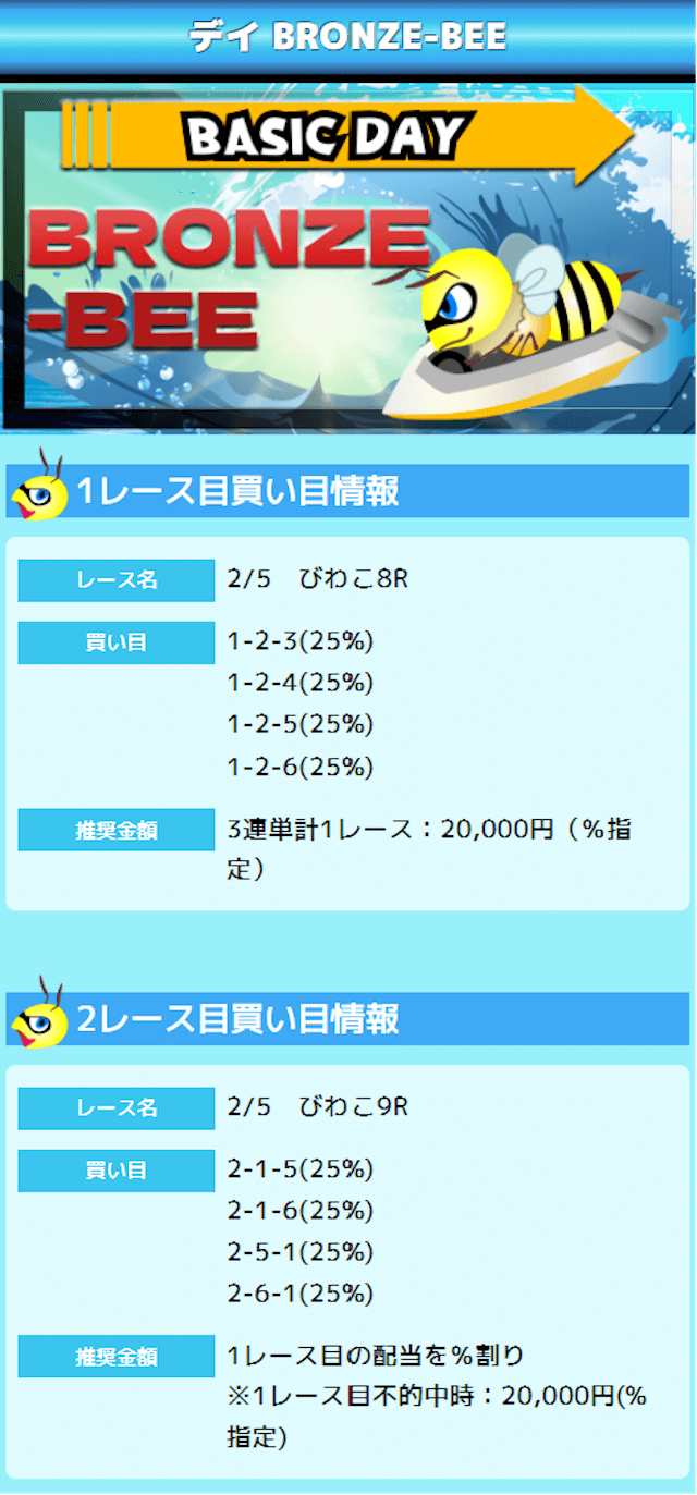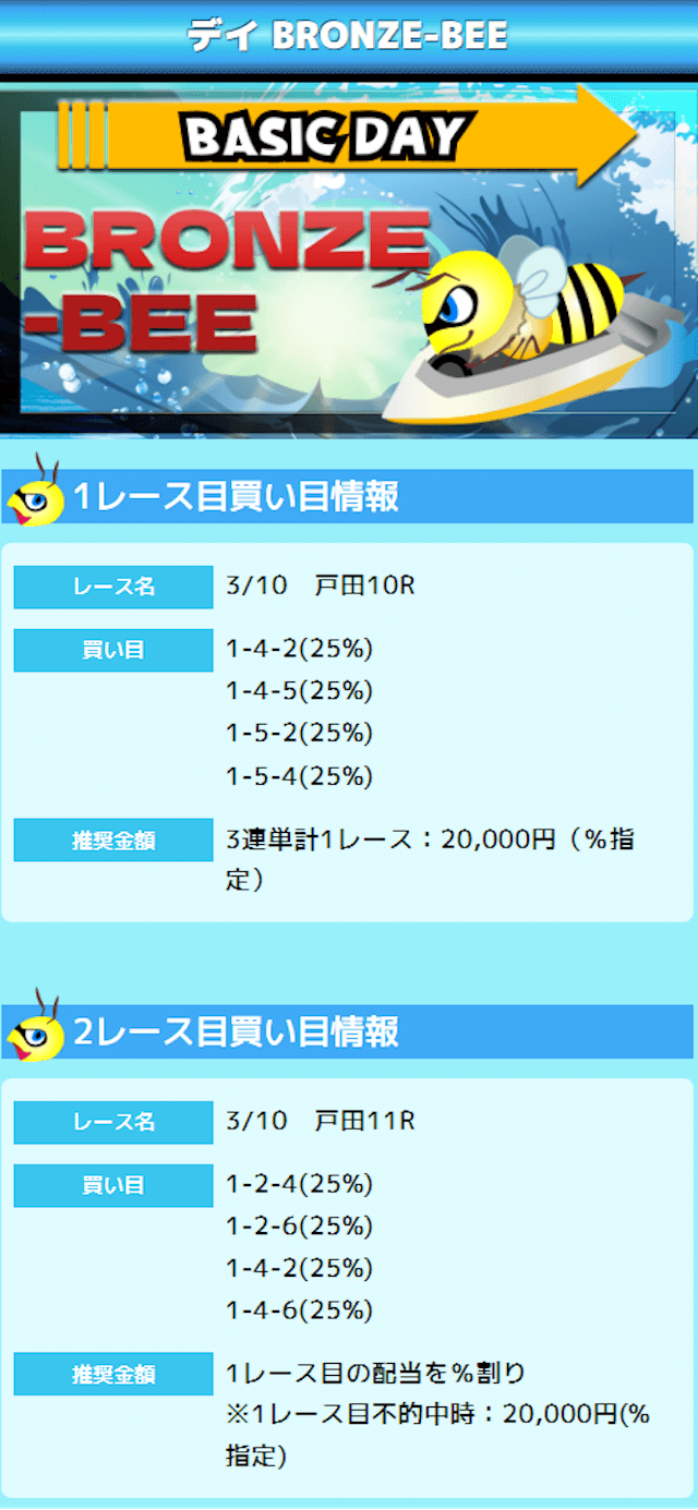| BRONZE-BEE | S | ★★★★★ | 目標金額を忠実に達成 無料予想からの乗り換えに最適 |