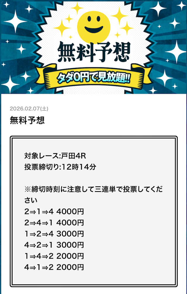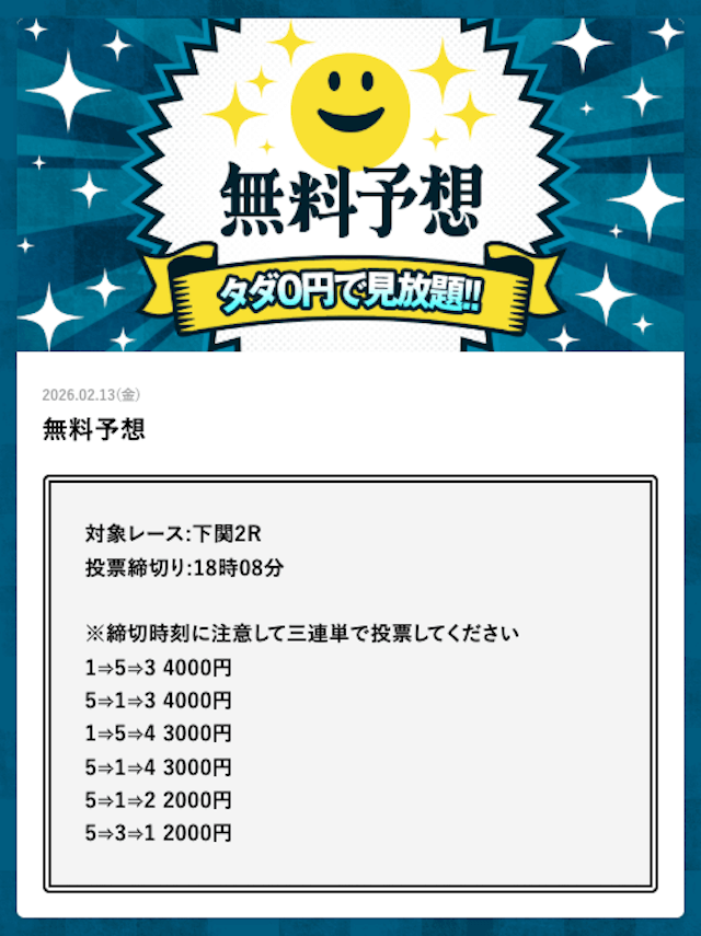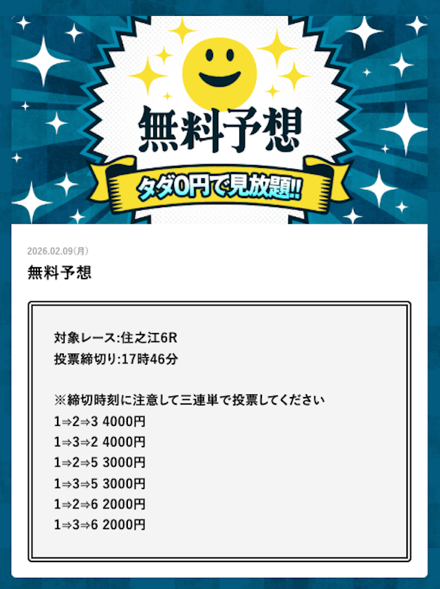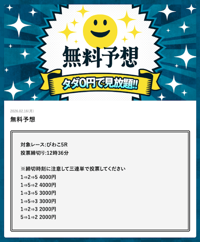 | 戦績 | 150戦127勝23敗 | 的中率 | 85% | 回収率 | 212% |