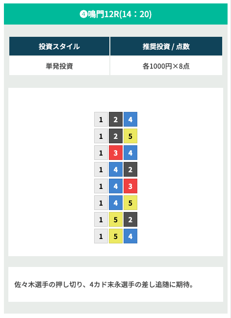 また、3・4コースの艇がまくりを決めると外側の艇が続く場合が多いので「3-4・4-5」の組み合わせを検討してみてください。