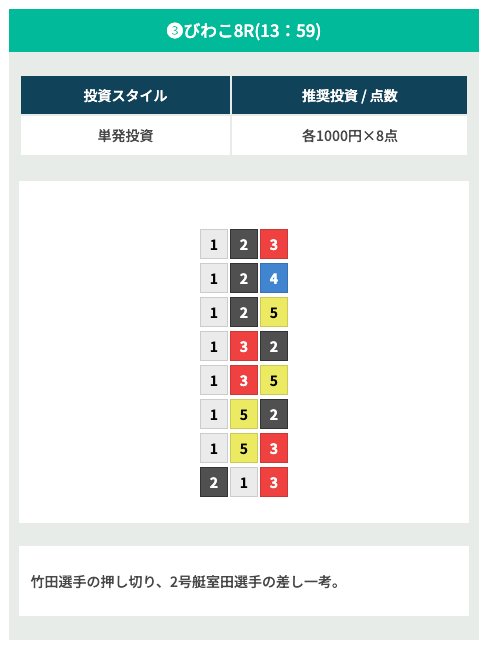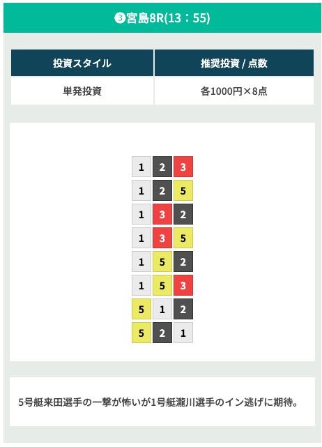 - 風速2m以上の際は「2・3・4・5・6-1」で予想を組むのが良い