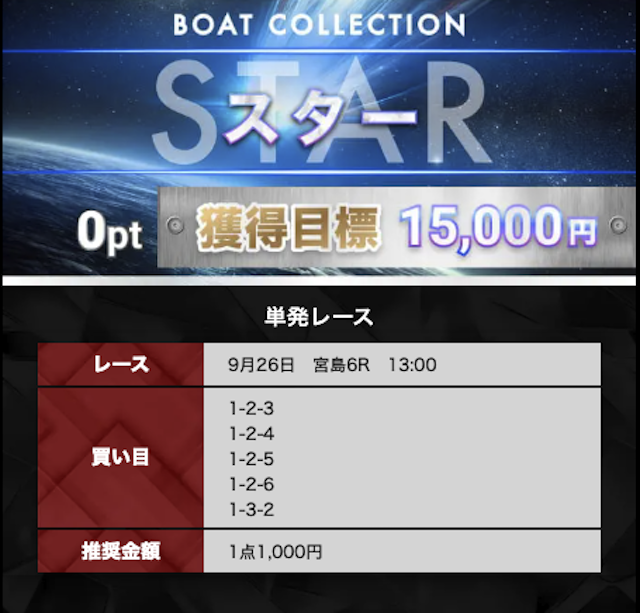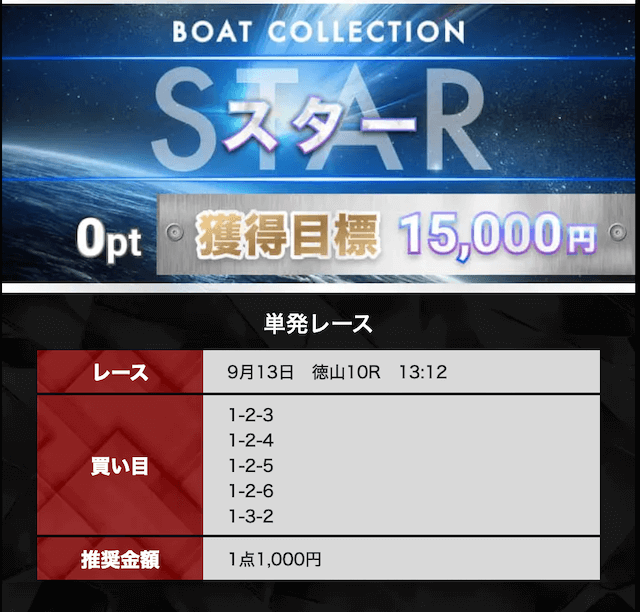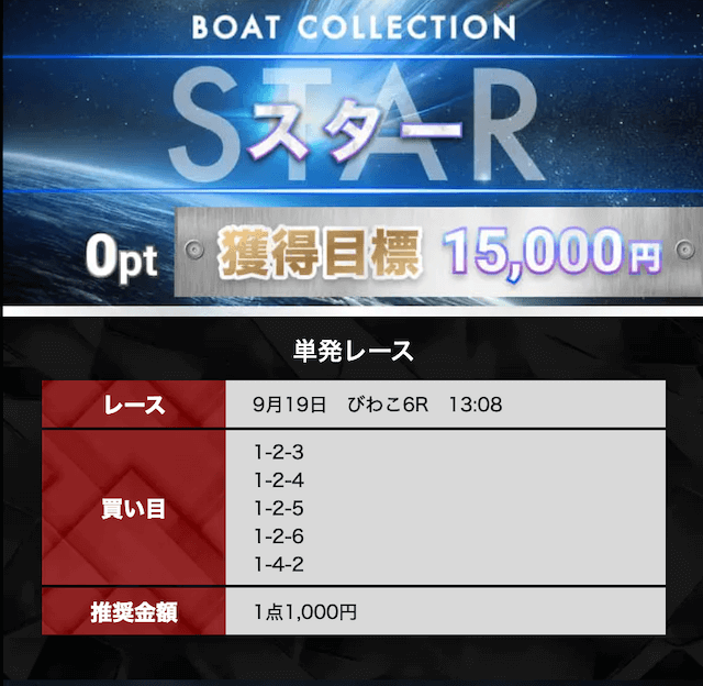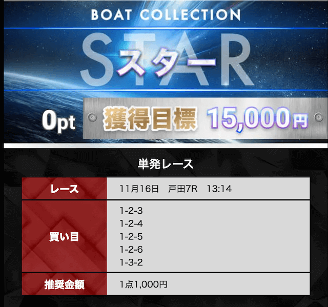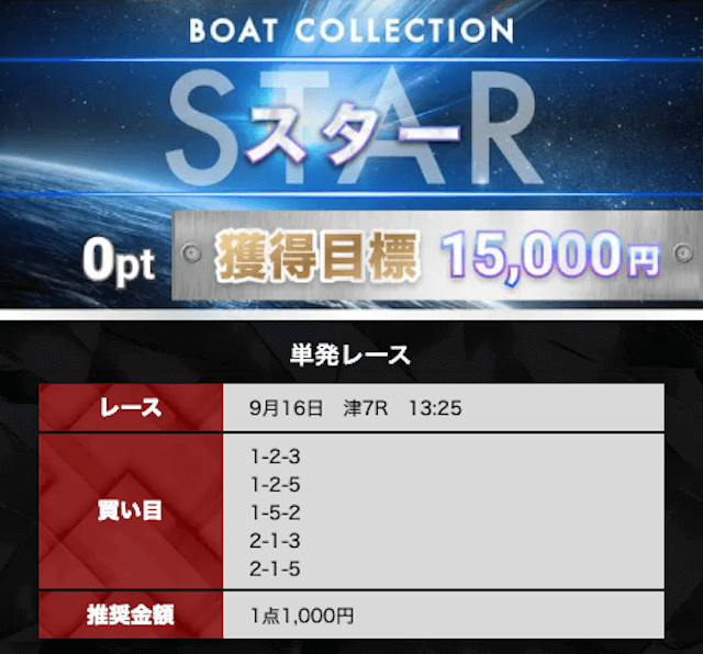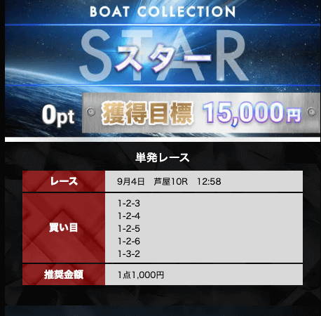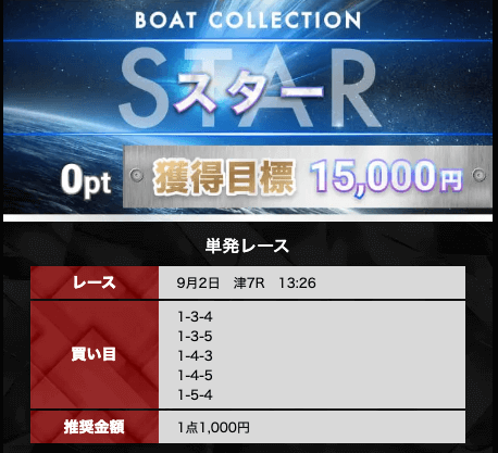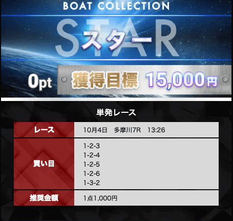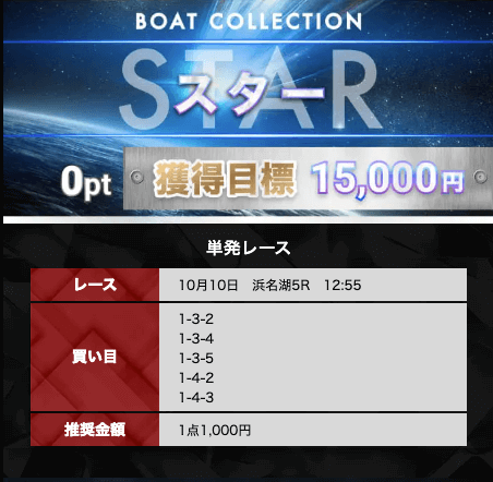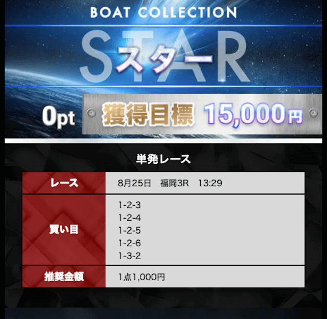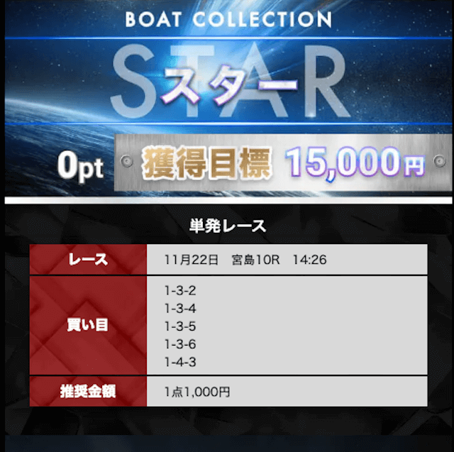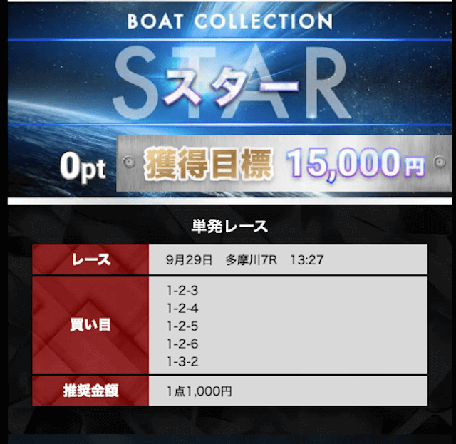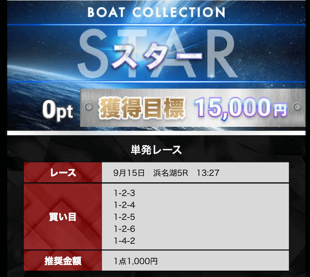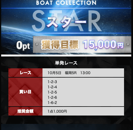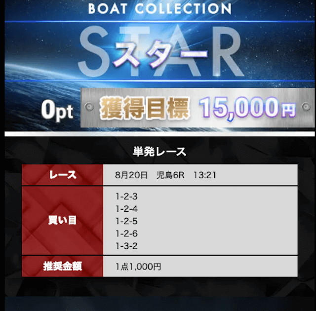 画面下部の「プラン」から「スター」という無料プランを選択することで、ボートコレクションの無料予想を確認することができました。