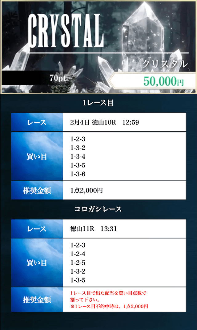 | CRYSTAL(クリスタル) ※お試しプラン | 7,000円 | 50,000円 | 7.14倍 | 2レースコロガシ |