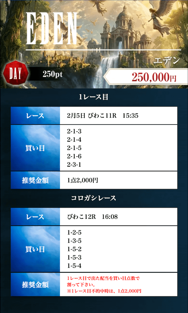 | EDEN(エデン) ※常設プラン | 25,000円 | 250,000円 | 10.00倍 | 2レースコロガシ |