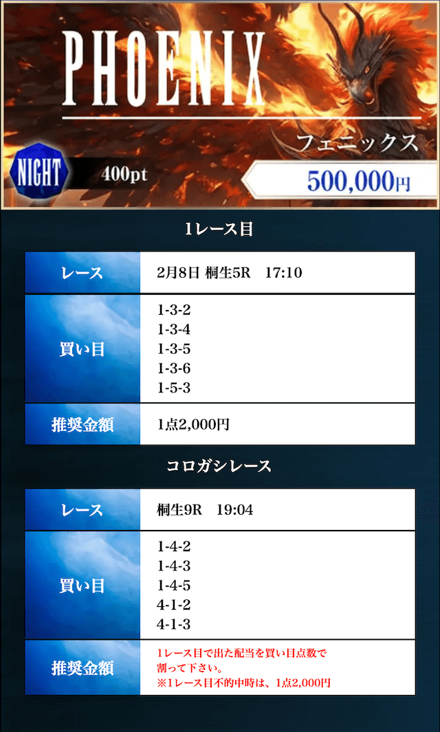 | PHOENIX(フェニックス) ※常設プラン | 40,000円 | 500,000円 | 12.50倍 | 2レースコロガシ |