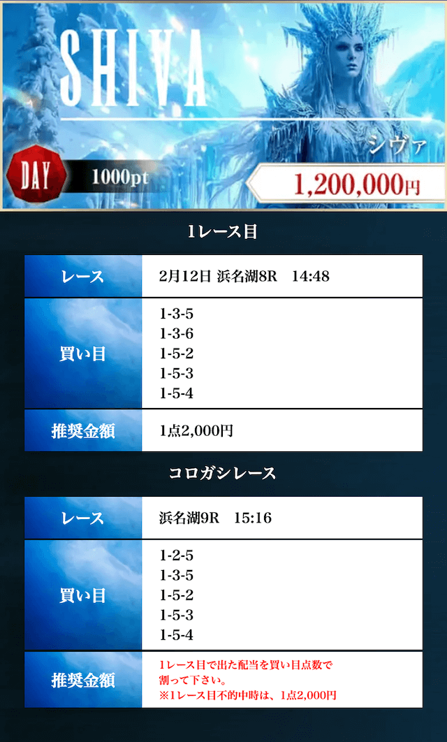 | SHIVA(シヴァ) ※常設プラン | 100,000円 | 1,200,000円 | 12.00倍 | 2レースコロガシ |