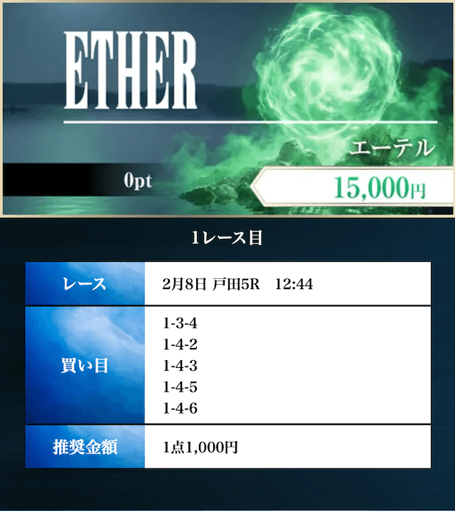| 戦績 | 5戦5勝0敗 | 的中率 | 100% | 回収率 | 1044% |