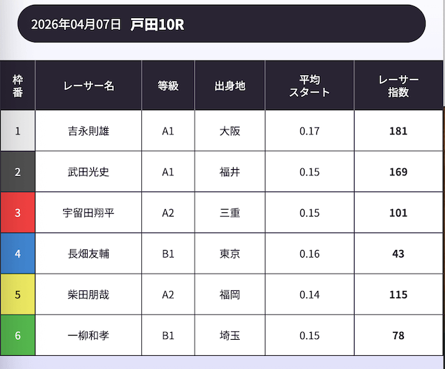 今走は唯一A1級の選手が1号艇に入っており、当然ながら1号艇に人気が集中する一戦でした。