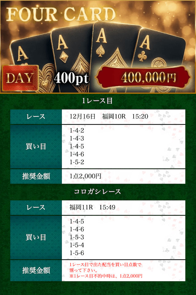 | FOUR CARD | 40,000円 | 400,000円 | 10.0倍 | 2レースコロガシ |