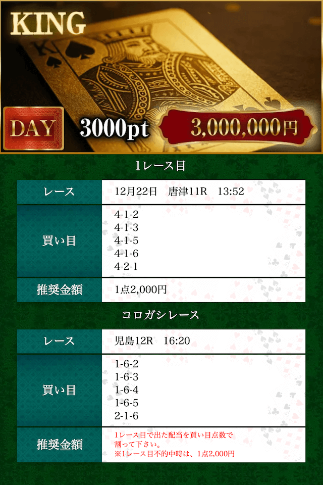| KING | 300,000円 | 3,000,000円 | 10.0倍 | 2レースコロガシ |