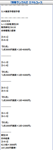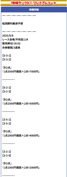 有料予想は予想師によって買い方のクセが違い、攻め型と堅実型がハッキリ分かれています。自分の資金状況や性格に合わせてプランを選べるのは、他のサイトにはない大きな魅力だと思いました。