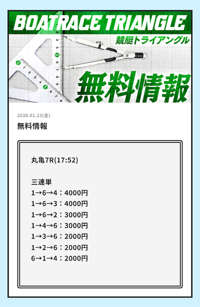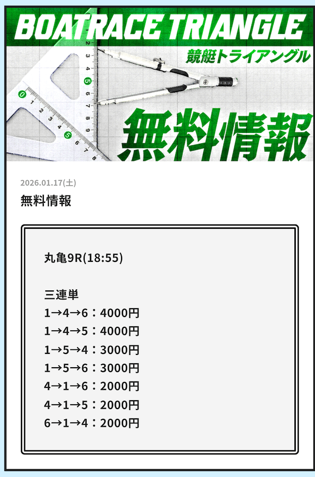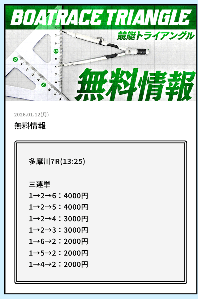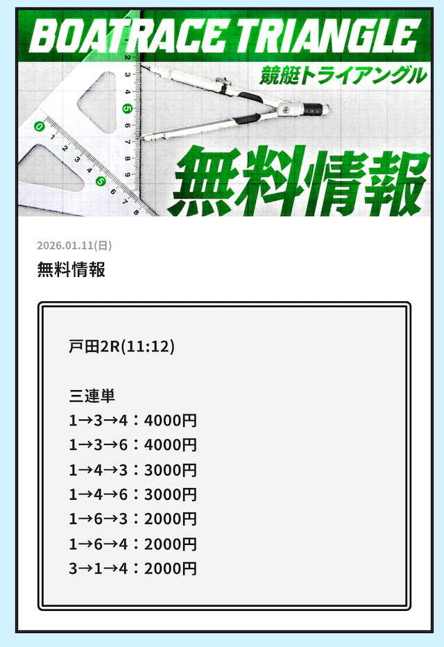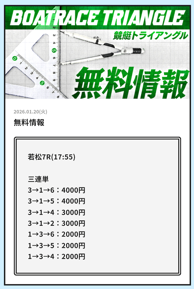 早速、競艇トライアングルが公開している無料予想の検証をご紹介していきます。