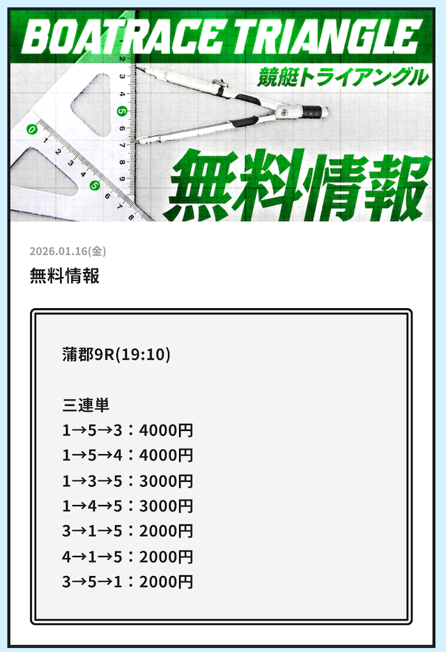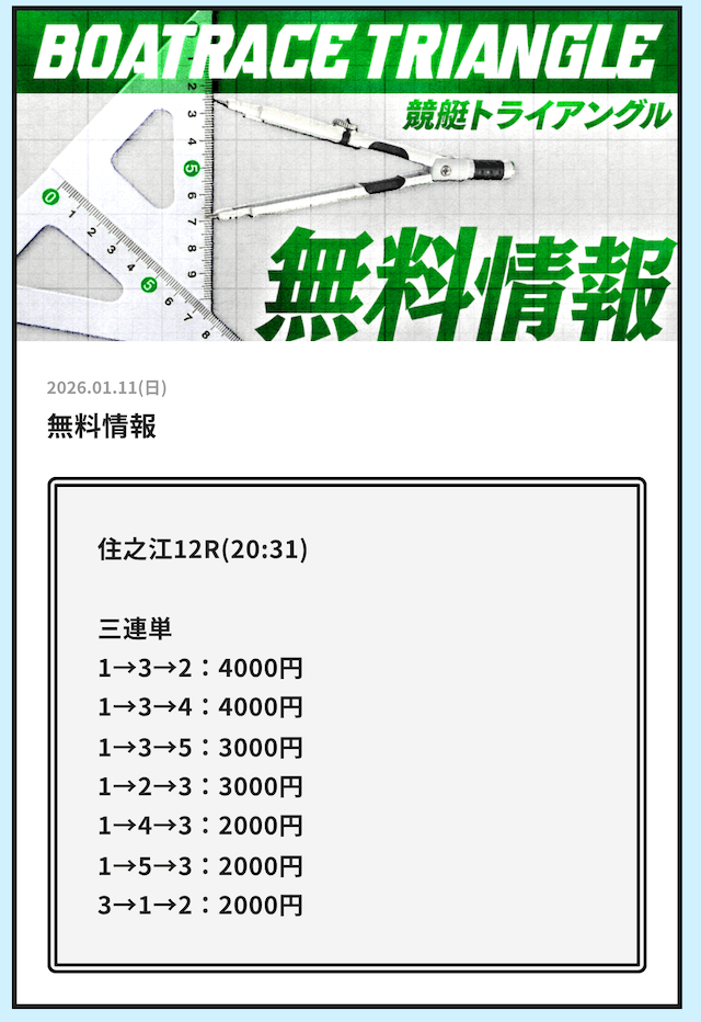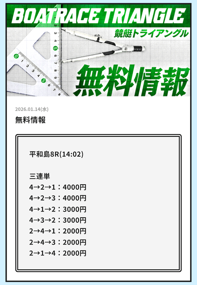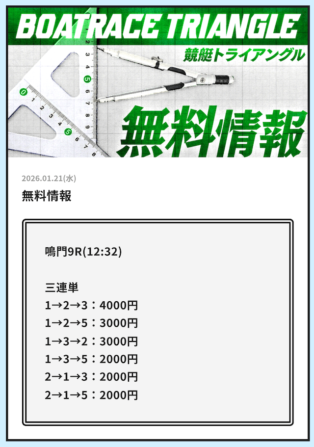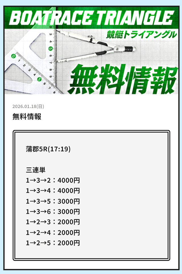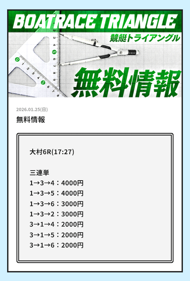 早速、競艇トライアングルが公開している無料予想の検証をご紹介していきます。