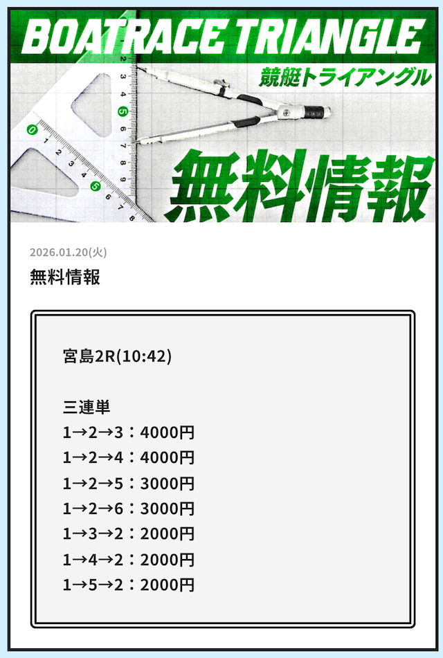 競艇トライアングルは毎日2レース分の無料予想を公開しています。