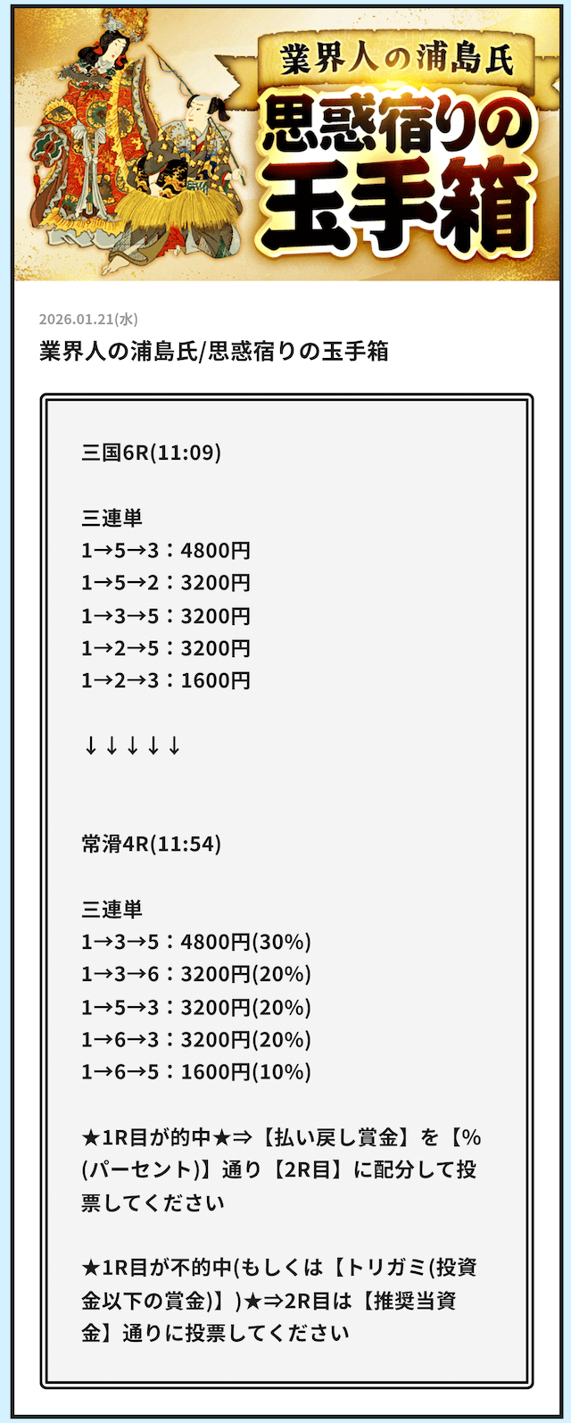 26日は昼の無料が平和島4Rで4万4400円の払い戻し、夜は不的中だった