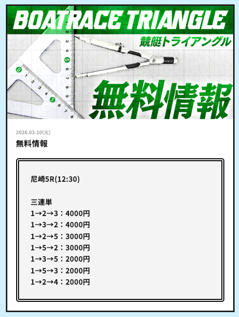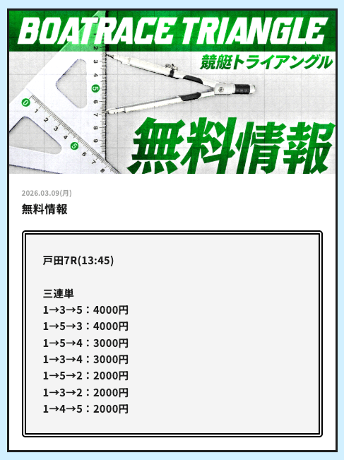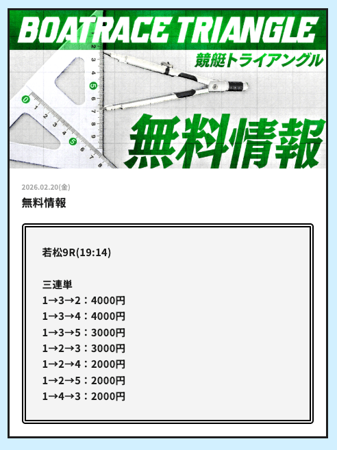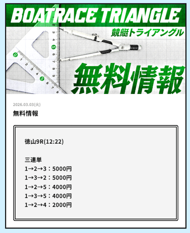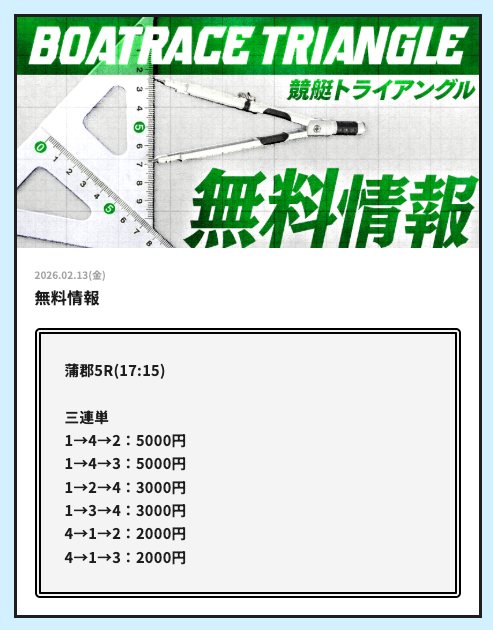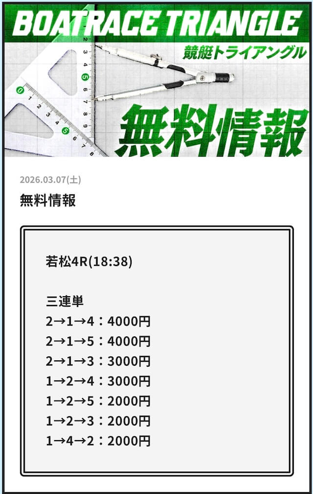 競艇トライアングルでは、毎日2レース分の無料予想を試すことができます。