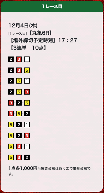 | 12月04日丸亀06R | 5-1-2 | 10,000円 | 0円 | 0% | |