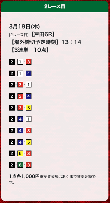 | 03月19日戸田06R | 2-3-1 | 10,000円 | 26,200円 | 262% | |
