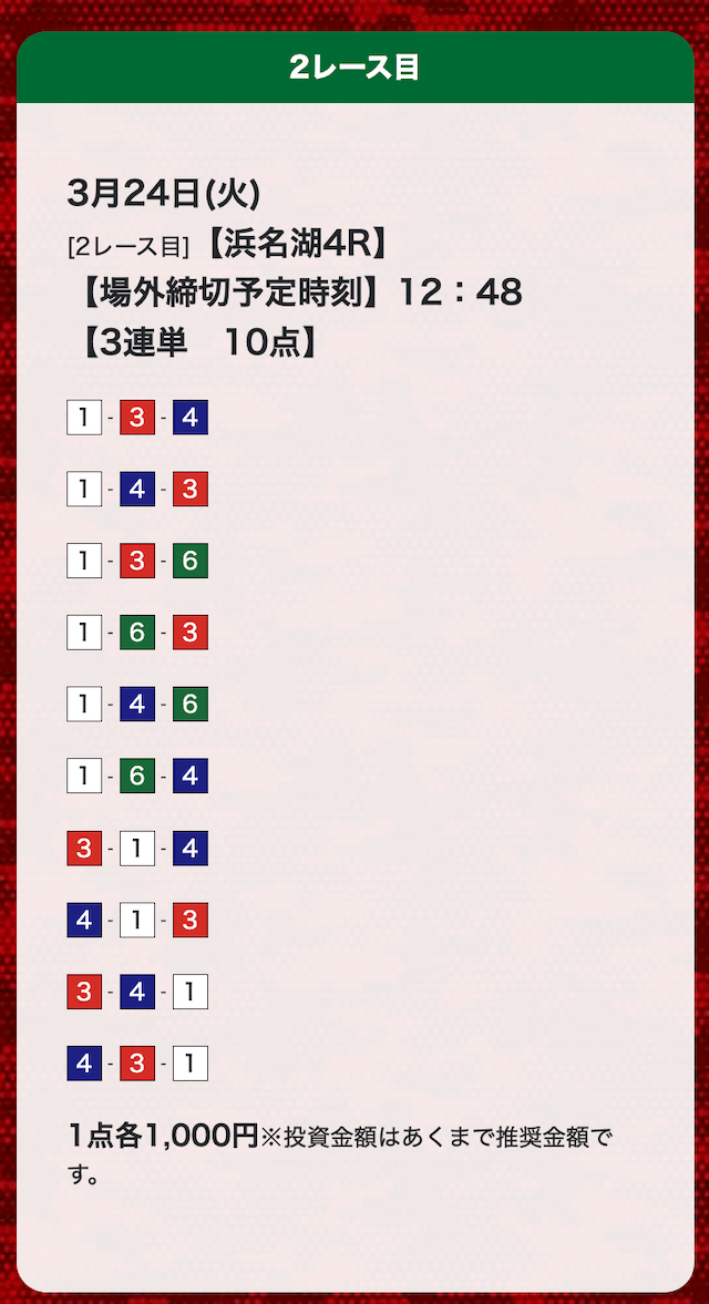 | 03月24日浜名湖04R | 1-3-6 | 10,000円 | 25,700円 | 257% | |