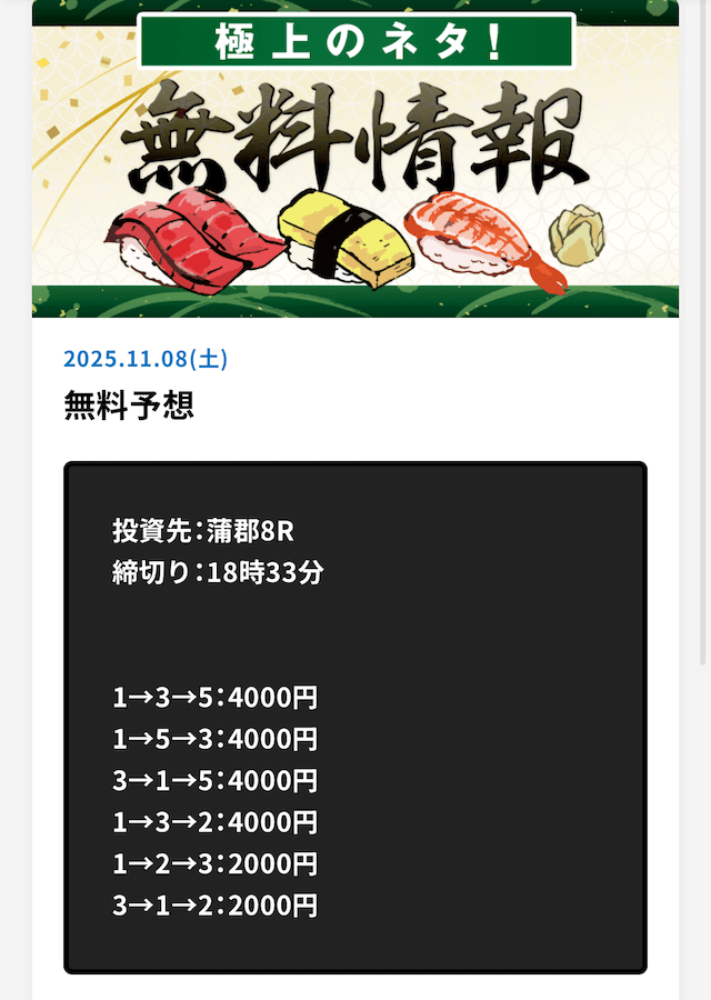 基本的に5点という少ない買い目点数で予想を公開しており、穴狙いのため的中率はかなり低くなっています。