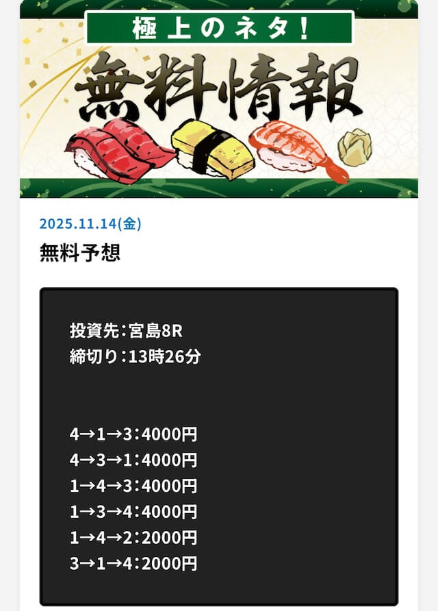 | 11月14日宮島08R | 1-4-3 | 20,000円 | 25,600円 | 128% | |