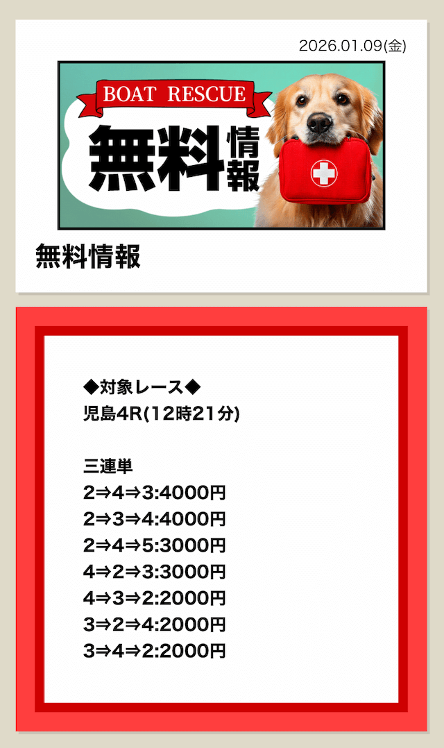 | 01月09日児島04R | 2-3-4 | 20,000円 | 58,000円 | 290% | |