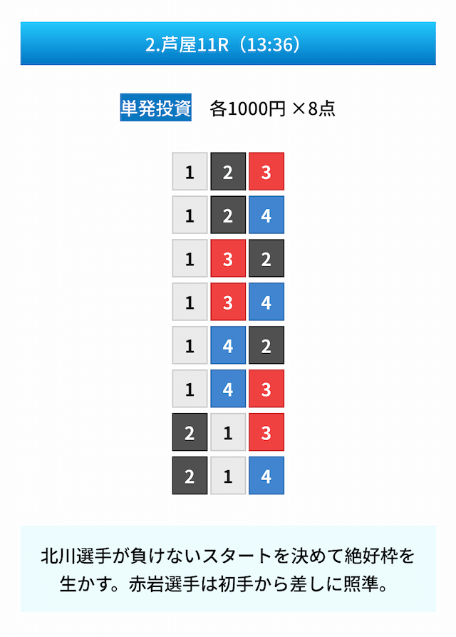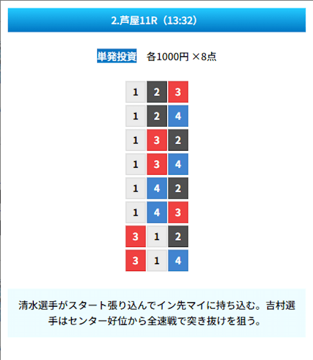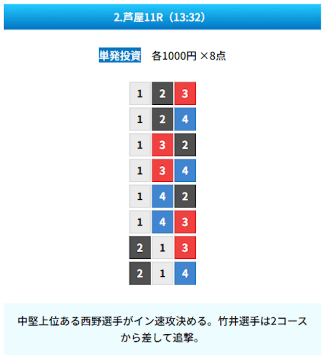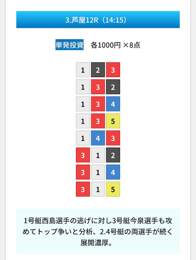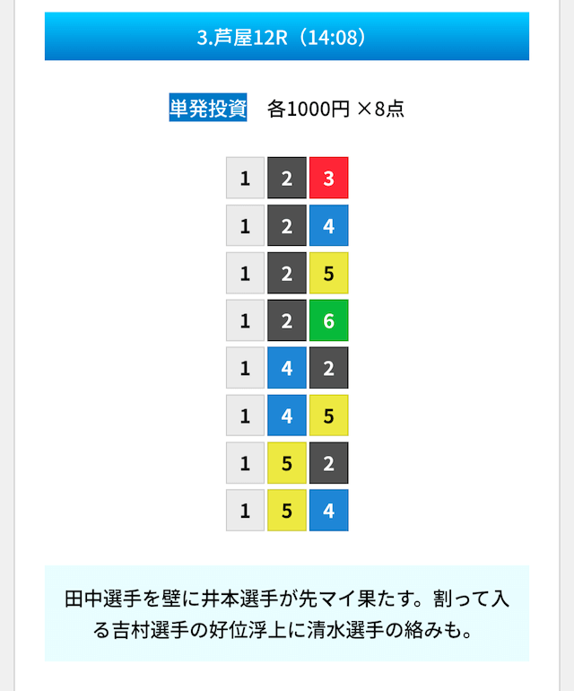 09月22日芦屋12R | 1-3-2 | 8,000円 | 12,400円 | 155% | |