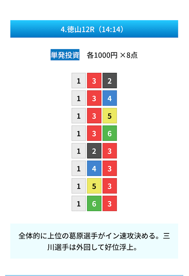 11月14日徳山12R | 1-2-6 | 8,000円 | 11,400円 | 143% | |