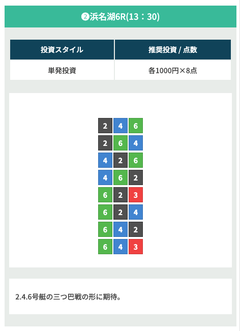 | 04月17日浜名湖06R | 3-4-6 | 8,000円 | 23,700円 | 296% | |