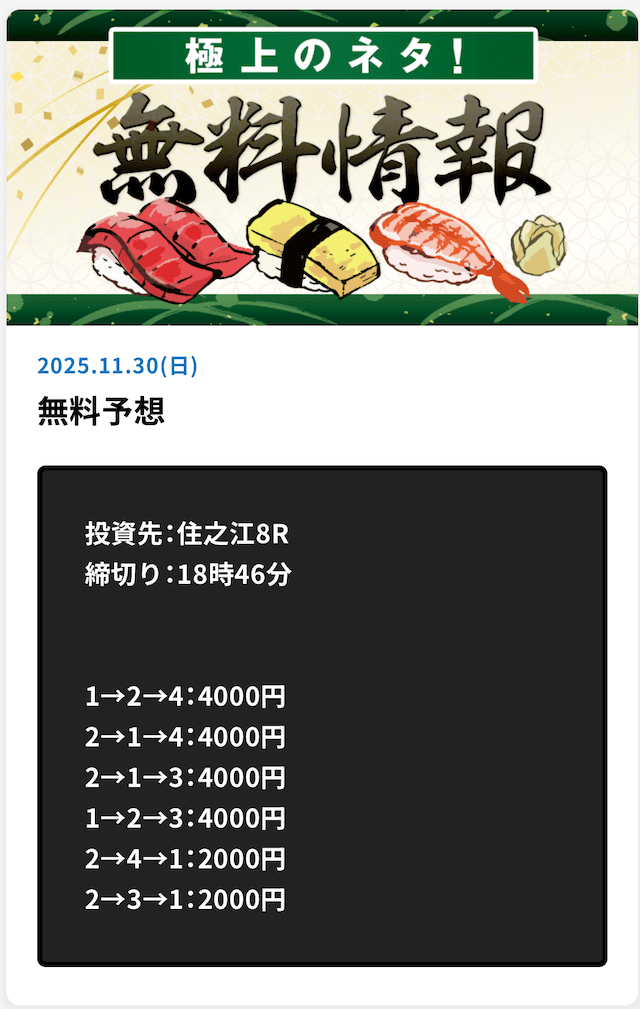 | 11月30日住之江08R | 1-2-3 | 20,000円 | 26,000円 | 130% | |
