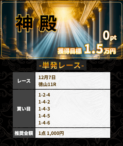 | 12月07日徳山11R | 1-4-2 | 5,000円 | 11,700円 | 234% | |