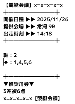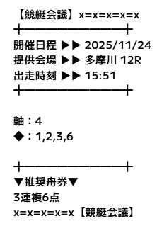 | 11月25日 桐生8R►桐生12R | 満場一致 | 的中 | 210,000円 | 5,051,640円 | 2406% |
