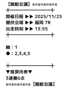 | 11月25日 桐生7R►桐生8R | 鶴の一声 | 的中 | 160,000円 | 3,328,600円 | 2080% |