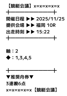 | 11月25日 蒲郡8R►蒲郡10R | 秘匿会議録 | 的中 | 510,000円 | 6,217,500円 | 1219% |