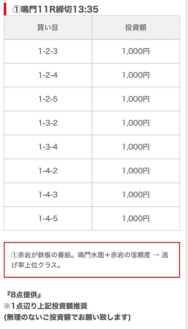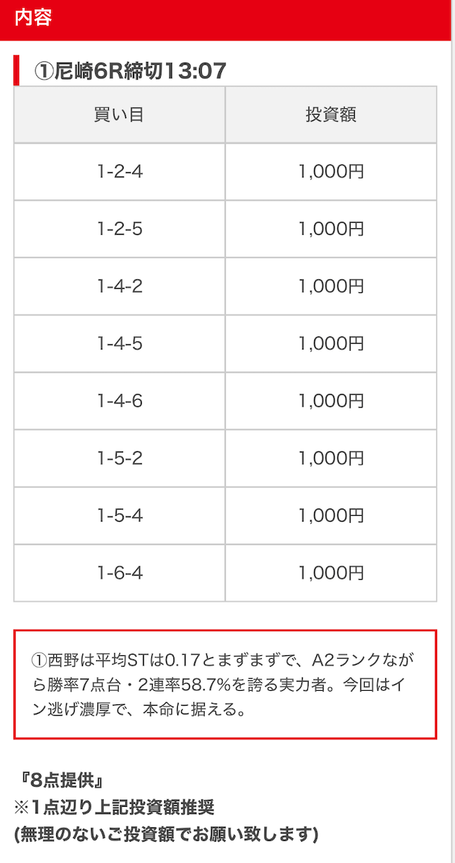 | 戦績 | 58戦50勝8敗 | 的中率 | 88% | 回収率 | 254% |