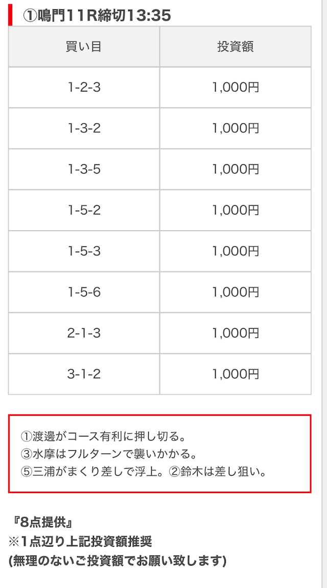 | 10月11日鳴門10R | 1-2-3 | 8,000円 | 8,500円 | 106% | |