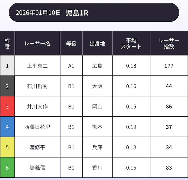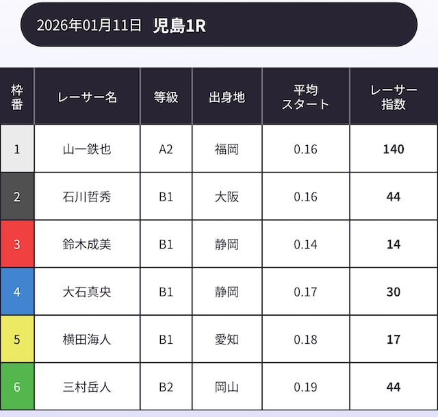| 01月11日児島01R | 1-2-6 | 6,000円 | 13,300円 | 222% | |