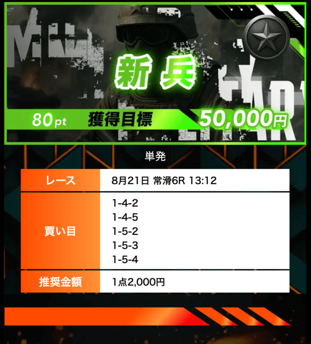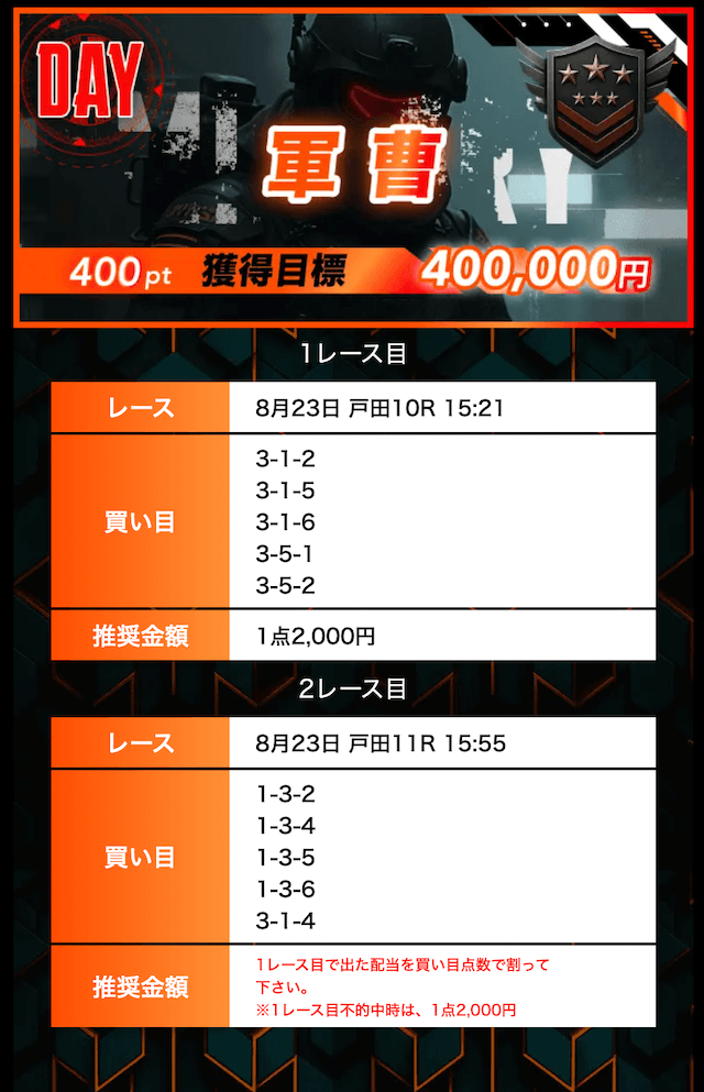 8月23日 戸田10R►戸田11R | 軍曹 | 的中 | 50,000円 | 345,530円 | 691% | |