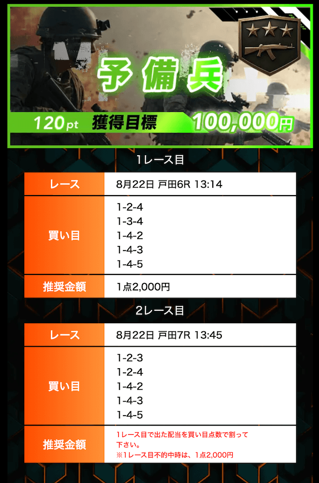 8月22日 戸田6R►戸田7R | 予備兵 | 的中 | 110,000円 | 104,040円 | 95% | |