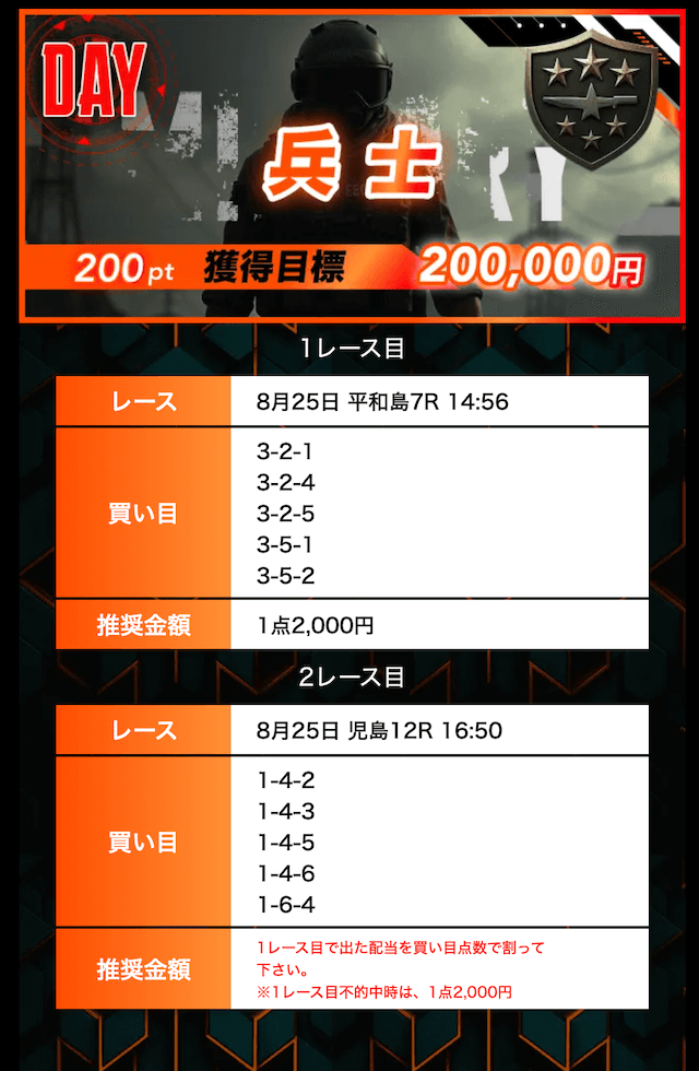 8月25日 平和島7R►児島12R | 兵士 | 的中 | 30,000円 | 174,720円 | 582% | |