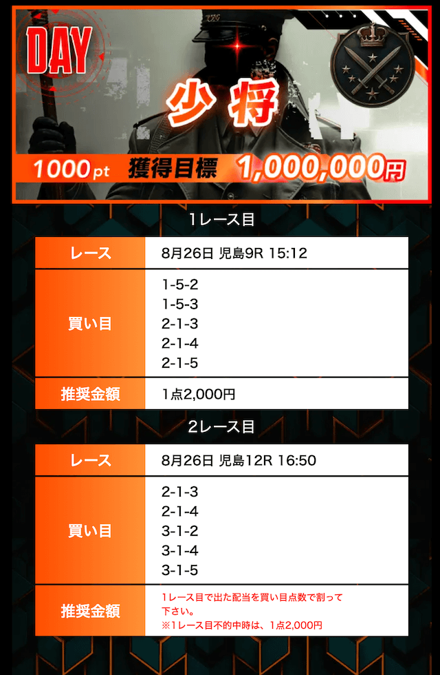 8月26日 児島9R►児島12R | 少将 | 不的中 | 110,000円 | 0円 | 0% | |