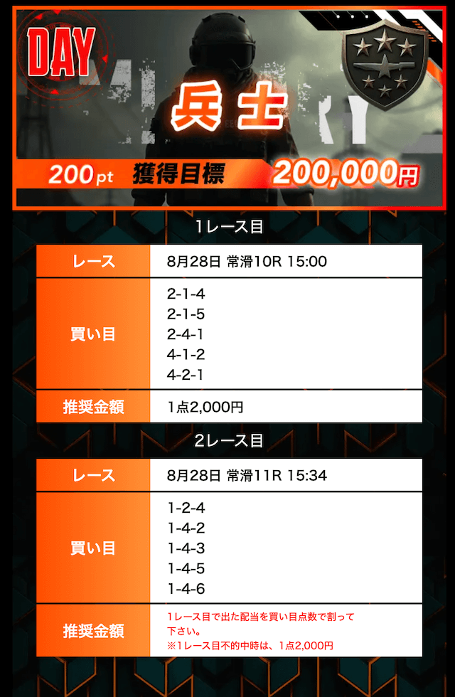 8月26日 びわこ11R►びわこ12R | 兵士 | 的中 | 30,000円 | 178,080円 | 594% | |