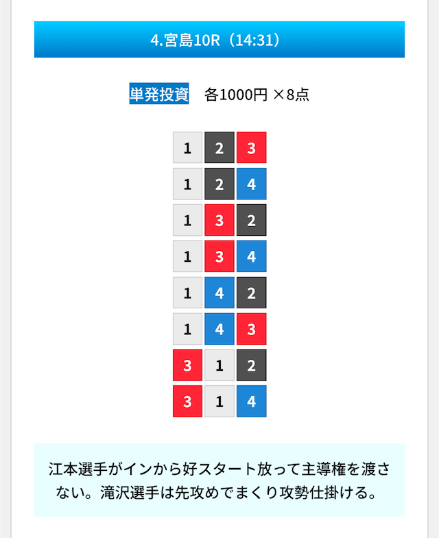 | 10月19日宮島10R | 1-4-2 | 8,000円 | 15,400円 | 193% | |