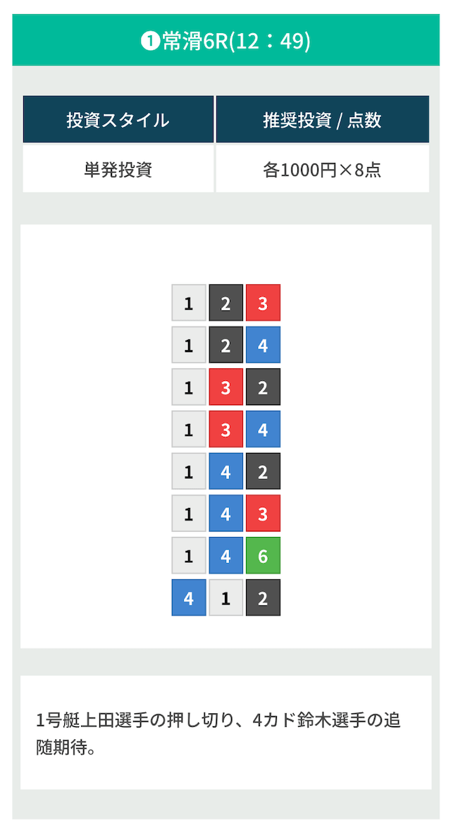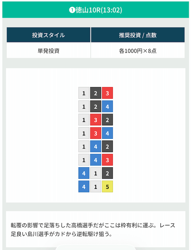 | 10月25日徳山10R | 1-4-2 | 8,000円 | 14,600円 | 183% | |