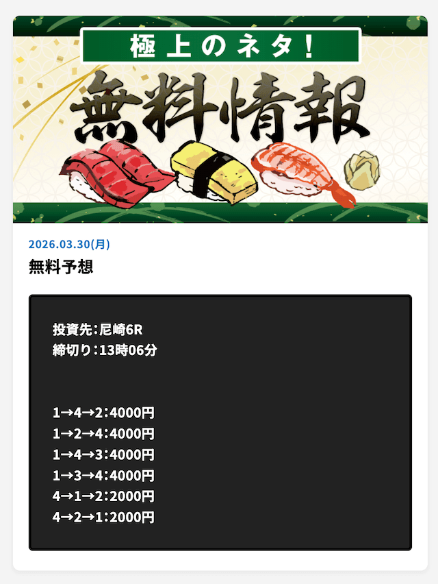 【3/30 多摩川12R 】 無料予想 +26,000円 |