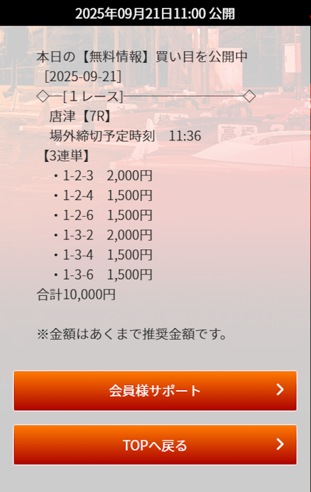 09月21日唐津07R | 1-3-6 | 10,000円 | 17,250円 | 173% | |