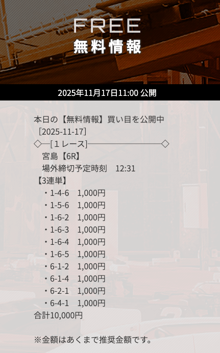 | 11月17日宮島06R | 1-6-5 | 10,000円 | 17,100円 | 171% | |