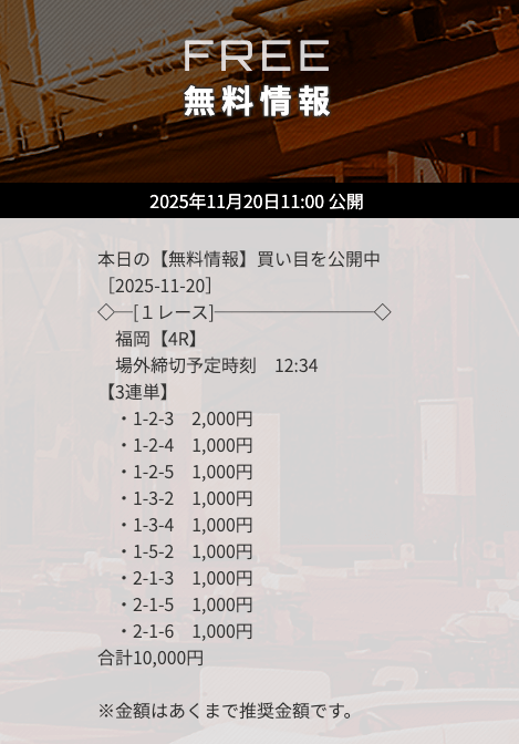 | 11月20日福岡04R | 1-3-4 | 10,000円 | 18,900円 | 189% | |