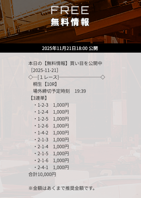 | 11月21日桐生10R | 1-2-6 | 10,000円 | 10,400円 | 104% | |