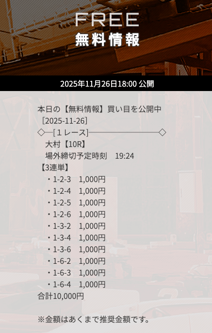 | 11月26日大村10R | 1-6-3 | 10,000円 | 21,300円 | 213% | |